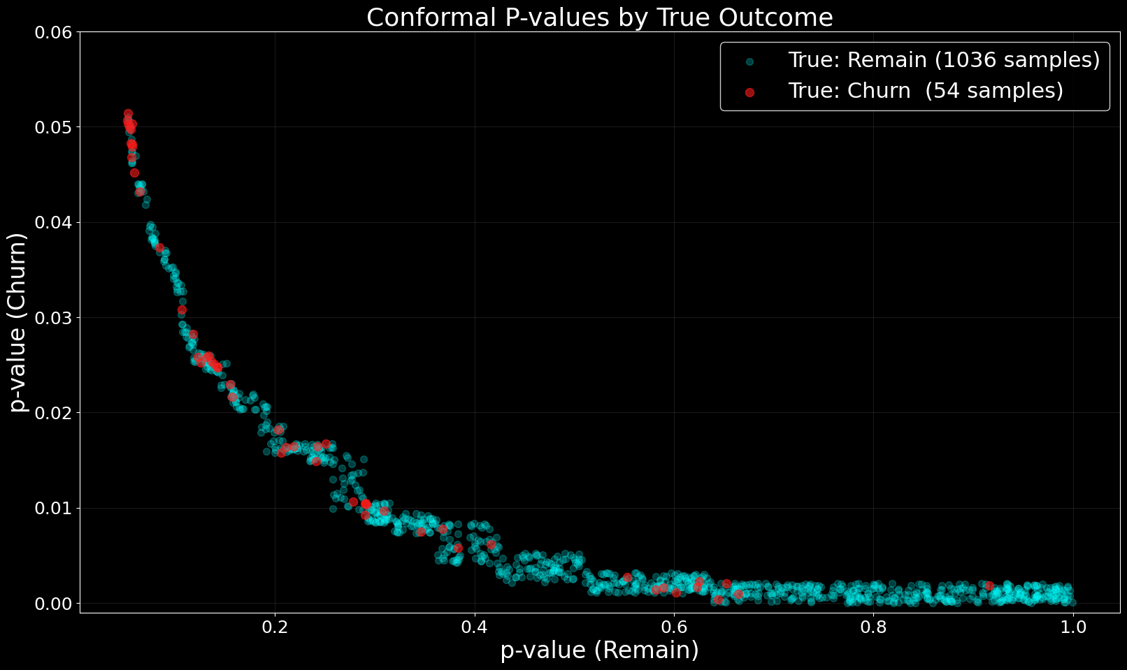 Recently, a customer offering a subscription service approached us with a churn case. The problem with churn cases is that the dataset tends to become highly imbalanced when we lower the time steps. Learn how we solved the case using mondrian conformal predictors. Recently, a customer offering a subscription service approached us with a churn case. The problem with churn cases is that the dataset tends to become highly imbalanced when we lower the time steps. Assume a 20% YoY churn rate. We can potentially handle this scenario using traditional ML methods, smart feature engineering, and oversampling. A 20% YoY churn rate equals 5% per quarter or 1.67% per month. Nasty imbalances! Therefore, when we want to use last quarter’s churn data to predict the outcome for the next quarter, we have 5% churn to work with. Takeaway: Balanced churn datasets indicate that the business experiences extremely high churn and are unlikely to survive. In this post, I will recreate parts of our process for completing the task using a random public dataset. You can find the code for this project on my GitHub. This public dataset describes a churn case for telecom customers and provides a good tabular dataset. The dataset shows excessive balance compared to the customer case, with “only” 26.54% of customers churning. Therefore, I downsampled it to 5% churners to match quarterly models. To keep this light and easy, I have not done any feature engineering or more intimate data massaging. I’m keeping this recreation simple focusing on the imbalance rather than chasing the perfect score. I also did not exclude a verification set since I did not perform any tuning. For our customer case, we developed the model using historical data and then ran the final model on the newest available data to prove the outcome. The analysis uses all models with default settings and employs the raw dataset, with the churn class downsampled to 5%, without any feature engineering. We start by building a bog-standard random forest model. We perform no parameter tuning and make no model choice adjustments. Leading to this model outcome: 95% accuracy must be good, right? Well. The model predicted that ~100% of customers would remain and caught ~0% of the customers who actually churned. Conformal predictors generate P-values for both outcomes: churn and remain. The Mondrian approach guarantees class-conditional coverage, ensuring valid prediction intervals for each target class separately. We can therefore leverage the model’s uncertainty quantification to identify churners, as Mondrian conformal predictors provide valid coverage guarantees for both churners and remainers despite the massive class imbalance. Beating through the dense statistical lingo we get the following properties: Perfect for a churn case with a class massive imbalance. Requirements Outcome The crepes package integrates traditional Scikit-Learn models with conformal prediction methods, including Mondrian conformal predictors. Those who want to explore the theoretical foundations in depth can find the corresponding papers linked in the repository’s citations section. First, we split the data into train, calibration, and test sets. We stratify by the target class to maintain the same 95:5 remain-to-churn ratio across all sets. Since the class imbalance is extreme, any variation in class distribution will easily degrade model performance. This stratification is particularly important for Mondrian conformal predictors, which compute class-conditional prediction sets and require consistent class distributions in the calibration set to ensure valid coverage guarantees for each class. We create a conformal classifier by wrapping the base random forest classifier. Calibration is trivial. As a final step, we compute the p-values from the withheld test dataset. When we scatter plotting the confidence vs. true outcome we obtain a nice spread. This is what enables us to create business value. We can quickly dismiss all data in the bottom right. In the top left we have a cluster of certain churners. Then we choose how many of the false positives in the middle we want. If the activation cost for attempting customer retention is very low, then accepting more false positives will generate real positive business outcomes. If the activation cost is high, we focus only on certain churners. Otherwise, we focus our attention elsewhere. Mondrian conformal predictors enable us to move ahead despite facing previously near-insurmountable imbalanced datasets. We perform no fine tuning or feature engineering in this recreation of the customer case. This establishes the baseline before we dig in, understand the dataset, derive more data about the customer, and then better inform the models. With the P-values in hand, we can focus on business value and choose our desired outcome on the scale that encompasses all possible outcomes: false positives, true positives, false negatives, and true negatives. The dataset